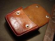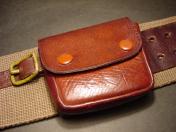 茶牛革 表面蓋部にスナップ留式の釦2個付く珍種の中型 帯革通付 縦8×横9×厚み2.8cm 支那事変頃〜大東亜戦初期頃に当時軍装店で販売していた純然たる国産品にして定寸法の略刀帯に縛着出来る形状 底部に経年のヒビによる裂け傷1箇所あるも光沢ある極美品 (画像に写る略刀帯は別売です)