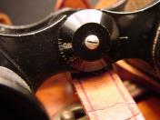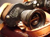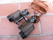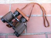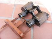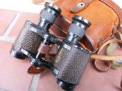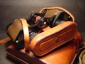 高級品 揃収納ケース「極美品」付 負革「極〜美品」に茶褐色の汗止布付 揃首掛紐「極美品」付 国産には珍しく茶牛革製のレンズ覆 「極美品」付 双眼鏡本体は目盛入 胴部フレーム右側に「IKK TOKIO〜同左側にHELL〜8×25〜2627」の打刻 本体の寸法は定寸の高さ11.5cm 負革〜首掛紐の裏面に津田俊雄のスタンプ印 本品は昭和10年前後の物と思われる国産品 内部プリズム「レンズ」の現状は 曇りあるも外観は極美品