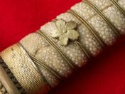 高級品 完全揃 柄は白親鮫 鞘は黒牛革製 目釘は桜花をあしらったネジ式 外装全長41.3cm 柄全長10.5? 刀身21.3cm 柄の金線 「ワイヤー」は完全 外装各部に使用されている金物「柄頭〜目釘〜鍔〜胴輪〜環〜コジリ含む」の山吹色「金鍍金」は程良く残存 珍しく コジリ金物の側面上下にネジ付 刀身は極〜美品 外装は柄の白親鮫部分含む極美品